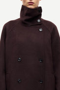 - Its double-breasted button closure and high funnel neck with buttons provide elegant warmth and sophistication.