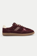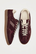 Crafted in deep burgundy suede with contrast cream trims for a standout finish.