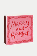 - Archivist’s signature square matchbox featuring a bold pink background with the words 'Merry and Bright' in a red handwritten font and a red detail border.