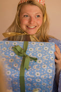 - Blue tissue paper wrap featuring dainty white flowers and birds with green and red accents.